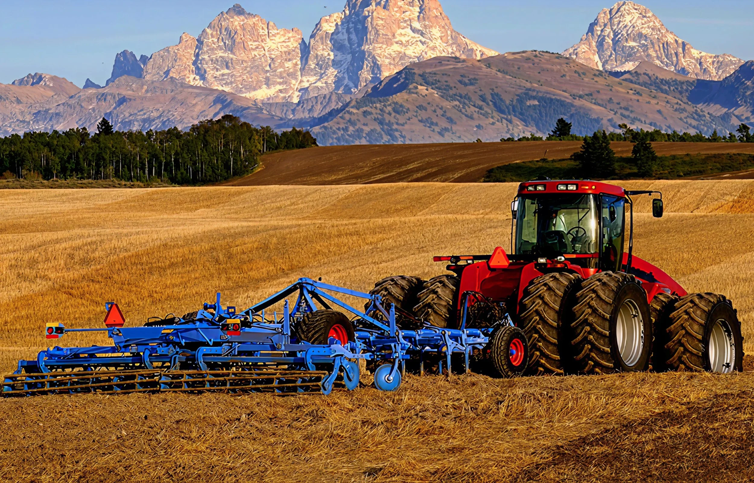 A tractor working in a yellow flower field on a farm with silos and barn structures in the background during sunset.
