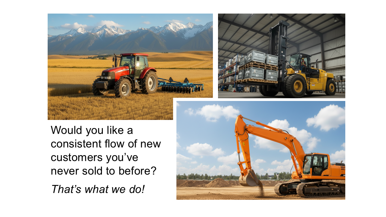 We specialize in the front-end of the sales process. We know how to get the right lists, including your competition’s customer lists. We can calendar when each end user in your sales territory plans to purchase equipment. And if they aren’t ready to purchase equipment, out of necessity they are maintaining the equipment they already have, and we aren’t shy about going after that business