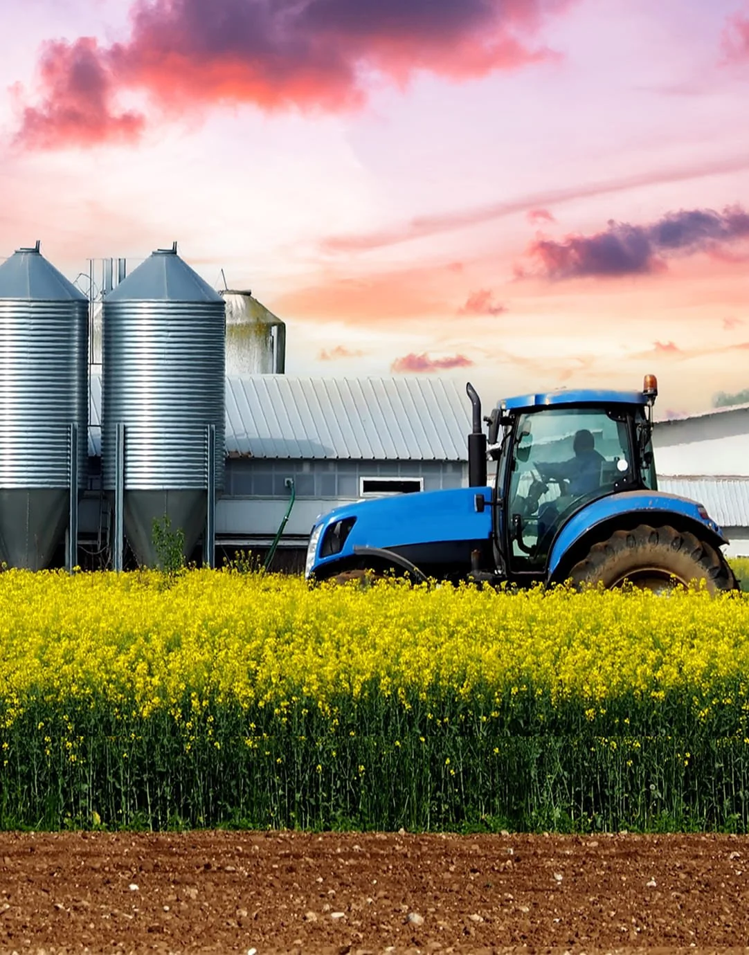 A tractor working in a yellow flower field on a farm with silos and barn structures in the background during sunset.